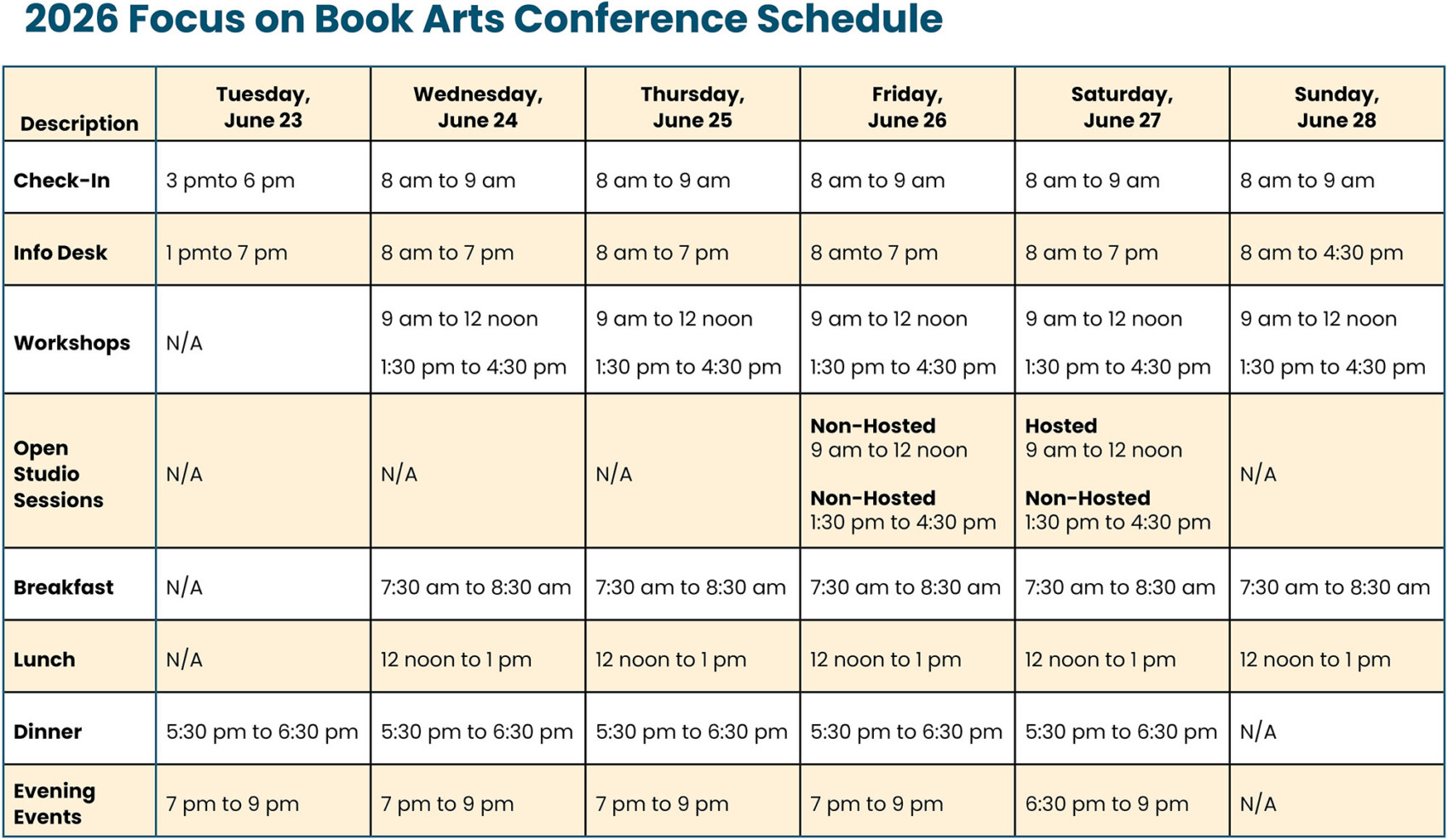 | Open Studio Sessions | N/A | N/A | N/A | Non-Hosted 9 am to 12 noon Non-Hosted 1:30 pm to 4:30 pm | Hosted 9 am to 12 noon Non-Hosted 1:30 pm to 4:30 pm | N/A |