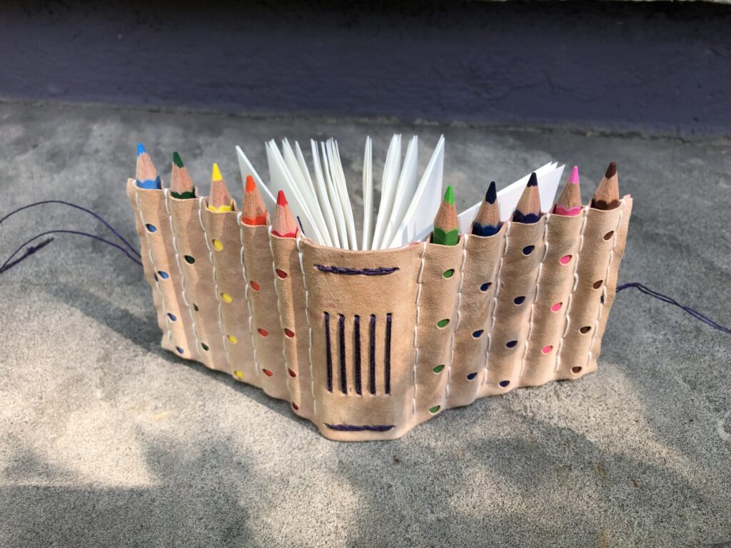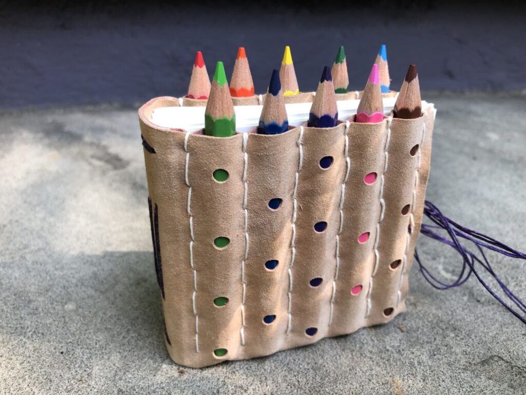 To begin, students will use a Japanese screw punch to make designs in suede leather to create a pattern that will expose the colored pencils. A cardstock spine will be adhered to the leather, then the suede will be folded and sewn to make channels for the mini pencils. The sewing pattern will be punched out of the leather and spine with the screw punch in preparation for sewing the text block.