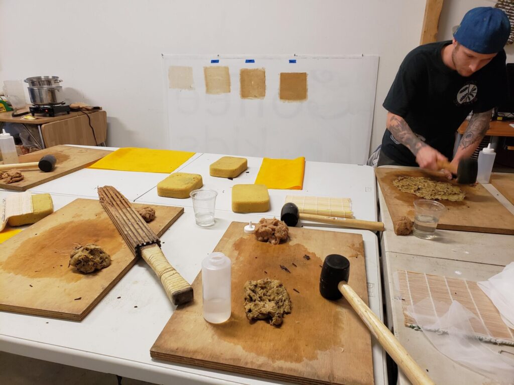 Day Three: Eastern Papermaking Explorations. In this workshop we will use imported bark fibers like kozo and gampi to create strong and translucent papers using techniques originating in East Asia. We will begin with a conversation about the history of craft practices using bark fibers to learn more about the origins of hand papermaking. We will then process raw bark fibers, cooking them and hand pulping them with mallets. We will use Japanese sugetas to make paper that students will take home to dry. All workshops will be hands-on, exploring process via communal activities and individual explorations of materiality.
